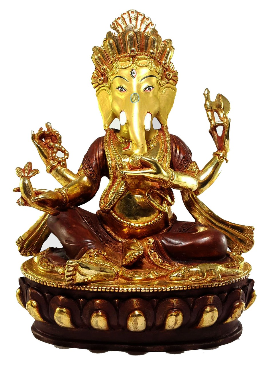 The Brass Ganesh Statue is a stunning work of art that depicts the essence of Lord Ganesh, the Hindu deity of knowledge and auspicious beginnings. Lord Ganesh is depicted in a standing pose in this statue, which has elaborate features and craftsmanship. Lord Ganesh is shown standing on a mouse, his holy chariot, representing his capacity to overcome hurdles and travel through difficulties. The use of brass as the principal material lends the statue a touch of refinement and longevity.
